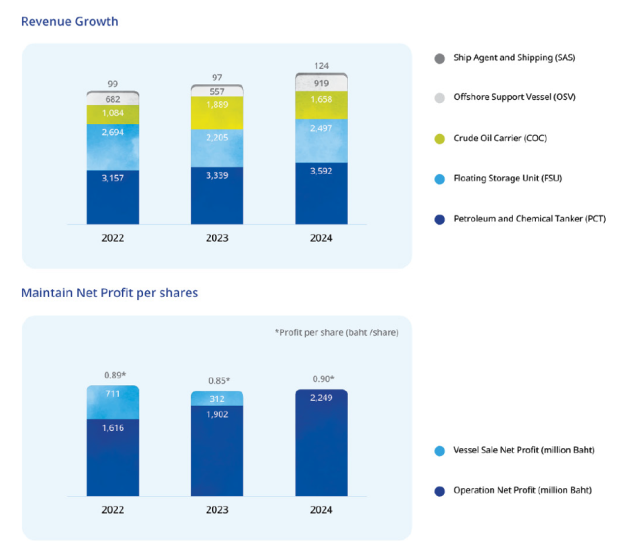 - Investing in the acquisition of 1 additional VLCC vessel to commence service for multinational oil trading companies starting in March 2025. The Company has set a policy for all 5 FSU vessels to serve oil traders who use them for storing and blending refined oil for sale to end users, including bunker fuel supply for commercial vessels in Singapore. As a result, revenue from FSU vessels remains stable compared to servicing customers who use them for speculative oil storage based on global crude oil price fluctuations.