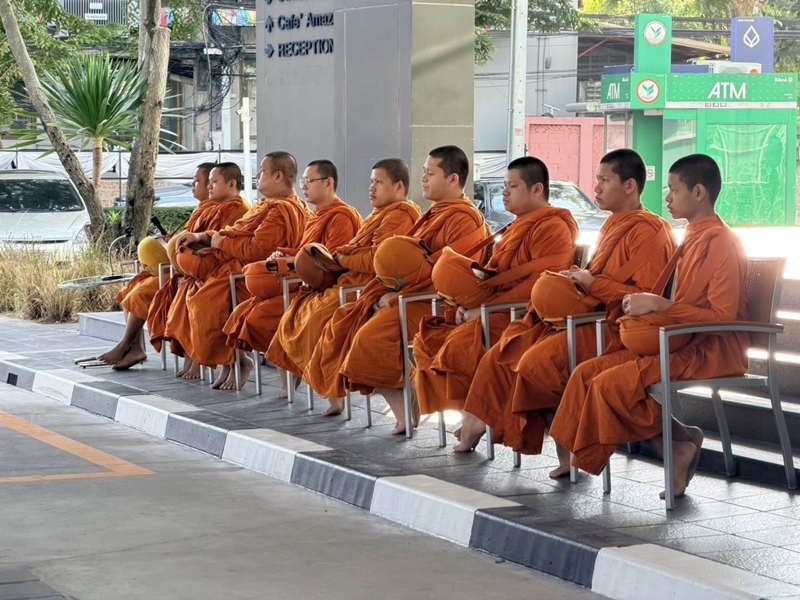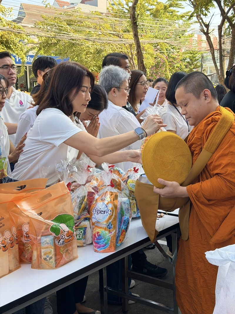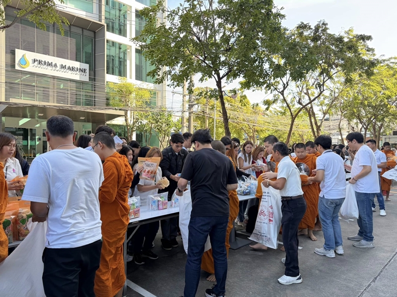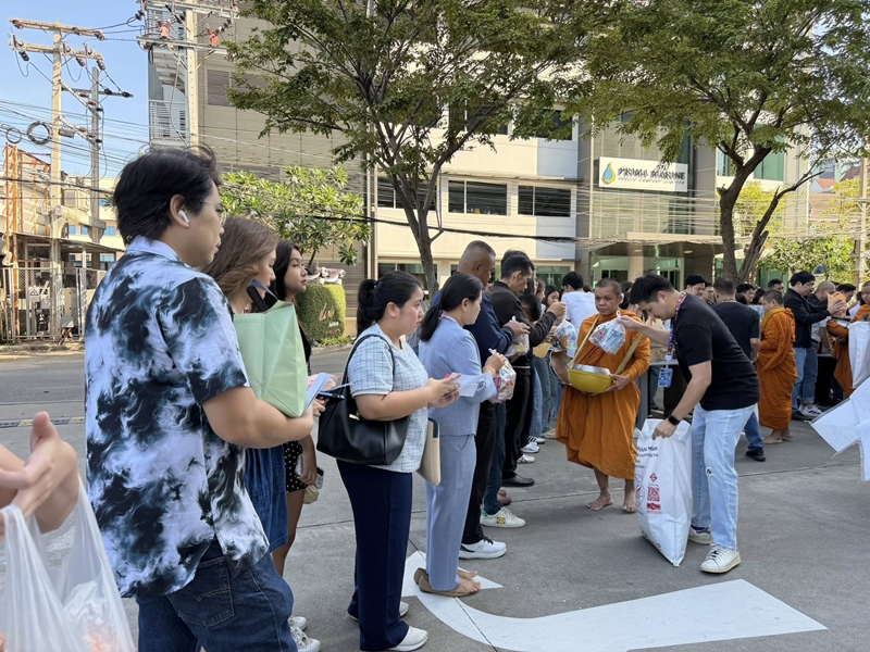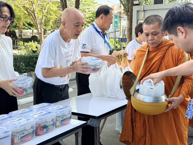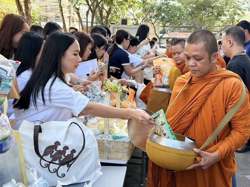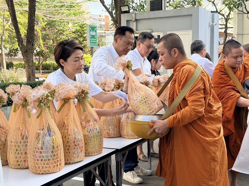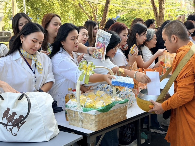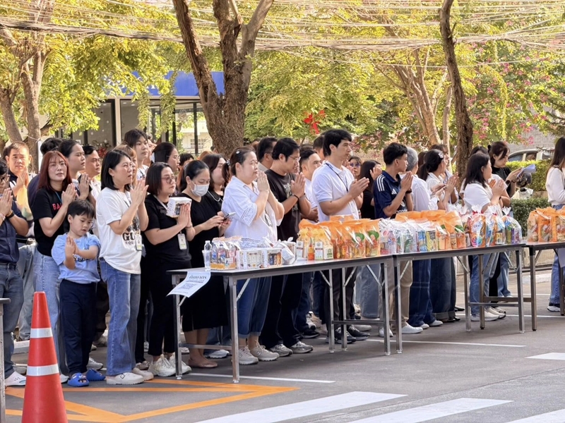 The atmosphere of making merit by offering food to monks on the occasion of the end of the old year and the beginning of the new year was filled with joy. The management and employees wholeheartedly participated in the ceremony, preparing savory and sweet dishes and necessary items to offer to the monks for good fortune for themselves and the organization.