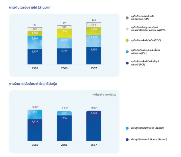 รายได้และกำไรสุทธิจากการดำเนินงานที่เติบโตอย่างต่อเนื่อง 3 ปีติดต่อกัน ภายใต้สถานการณ์เศรษฐกิจที่มีความอ่อนไหว อันเป็นผลมาจากความขัดแย้งทางภูมิรัฐศาสตร์ ที่นำไปสู่การกีดกันทางการค้าและการพัฒนาด้านเทคโนโลยีระหว่างจีนกับสหรัฐอเมริกา และความขัดแย้งระหว่างยูเครนและรัสเซียที่ยังยืดเยื้อตามด้วยสงครามระหว่างอิสราเอลและกลุ่มฮามาส ที่นำไปสู่การผันผวนของราคาน้ำมันในตลาดโลกอย่างต่อเนื่อง สะท้อนให้เห็นถึงศักยภาพของโครงสร้างธุรกิจของบริษัทฯ ที่เข้มแข็ง จนสามารถต้านทานผลกระทบที่เกิดจากการเปลี่ยนแปลงของสภาพแวดล้อมทางธุรกิจ และสร้างผลตอบแทนที่ยั่งยืนให้แก่ผู้ถือหุ้นได้ตามเป้าหมายที่วางไว้ สำหรับการขายเรือเก่าที่มีอายุครบการใช้งาน บริษัทฯ จะเลือกเวลาในการขายให้สอดคล้องกับช่วงที่เรือเก่าถึงเวลาจะต้องเข้าอู่ซ่อมเพิ่มเติมและความพร้อมของเรือที่จัดหาใหม่เพื่อทดแทนเรือเก่า ควบคู่กับการพิจารณาถึงราคาเรือเก่าที่อ้างอิงราคาเหล็กในตลาดโลก เพื่อให้เกิดประโยชน์สูงสุดเนื่องจากเรือเก่าที่ครบอายุการใช้งานส่วนใหญ่จะถูกขายเป็นเศษซาก (Scrap) ทั้งนี้ในปี 2567 บริษัทฯ ขายเรือเก่าขนาดเล็กออกไป 1 ลำ ในราคาทุน โดยคาดว่าในปี 2568 จะขายเรือเก่าออกอีก 1-2 ลำ